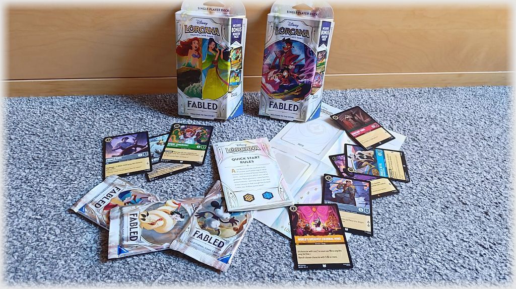 Fabled je set, který má učinit hru přístupnější a snadnější úplným nováčkům (Takoví se ještě najdou?) a zároveň zachovat kontinuitu pro veterány, kteří už mají doma plná albíčka předchozích setů a kartiček. Set Disney Lorcana: Fabled vyšel nejdříve 29. 8. 2025 ve specializovaných herních obchodech a pak ještě 5. 9. 2025 v širší distribuci hračkáren a podobných obchodů. Sada obsahuje opět zhruba dvě stovky karet a přichází v docela obyčejném a klasickém produktovém portfoliu: tedy v podobě jednotlivých maličkých boosterů, booster boxů, sady pro jednoho hráče (Single-Player Deck) a obvyklých dárkových balení Illumineer’s Trove. Oproti předchozímu tématu Reign of Jafar z přelomu května a června tedy nepřináší nic pro sólové hraní.