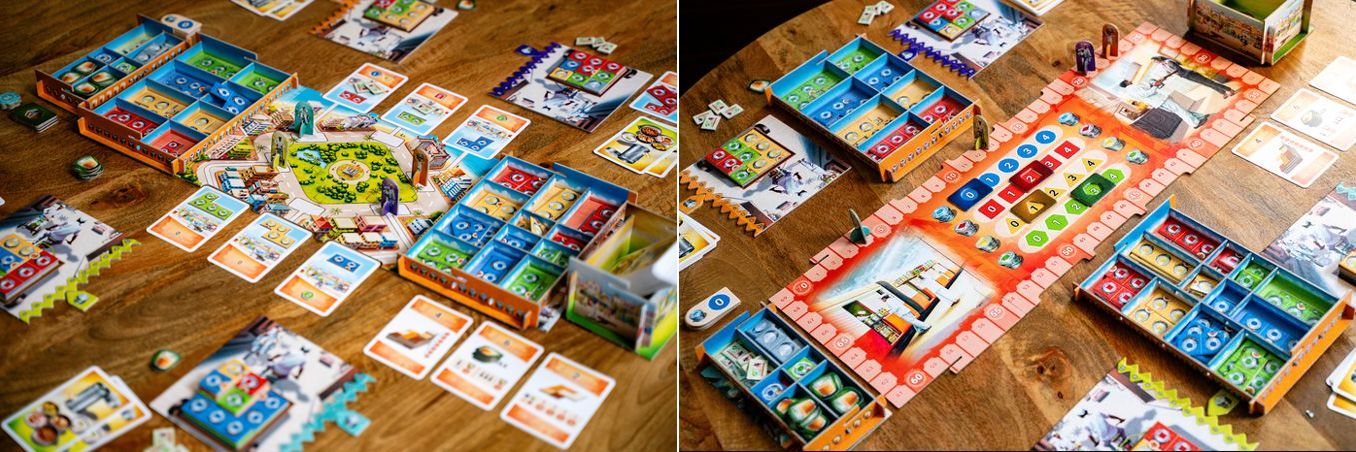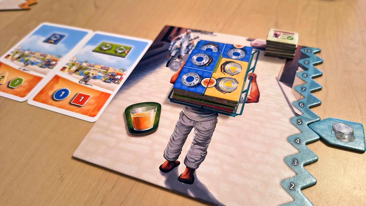 Jakmile zastavíte u vybrané karty, tu si vezmete do ruky, takže spolu se dvěma startovními kartami máte na výběr ze tří palet s jídlem. Jednu kartu odložíte, načež si vezmete příslušný dílek jídla ze zásoby a vložíte si jej na svůj vozík, krosnu nebo kolo, samozřejmě zarovnaný jako v Tetrisu. Pointa je v tom, že samozřejmě chcete svůj náklad co nejvíce rozšířit, na což se dobře hodí velké dílky, jako např. čtvercová paleta 2×2 nádobky. Jenže tyto větší dílky zase nedokážou navyšovat pozdější dýško, což jsou ty číselné terčíky na spodku karet (na střed se dávají proježděné jízdenky, takže kdo si později vezme kartu, bere si i jízdenky na ní). Vy totiž potřebujete v první fázi pobrat co nejvíc jídla, ale také za to v druhé části dostat co nejvíce peněz.