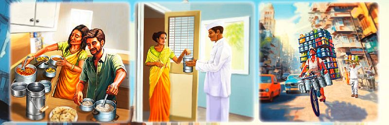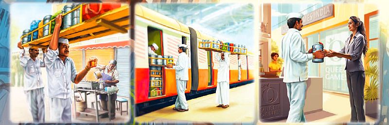 Byla to tehdy velmi dobře zaplacená práce pro negramotné kurýry, načež se do dnešní doby tento systém, nyní spravedlivě spravovaný nadací, rozrostl do armády více než 5000 poslíčků s vozíky a koly, kteří každý den po celé Bombaji ekologicky dodají přes 200.000 tisíc jídel. Obecně tato domáčtější varianta na službu „Dáme jídlo“ funguje tak, že mezi 7 až 9 ranní se poslíčci rozjedou do bytů a domků, kde nasbírají várnice s jídlem. Naloží si je do pečlivě organizovaných stohů na vozících a kolech na sebe v takových počtech, jaké by Evropan nedostal ani do dodávky. Mezi 9 až 10:30 kurýři dorazí na místa třídění určená pro každé regiony a distrikty. Do 12. hodiny se várnice složí do vlaků a zavezou poblíž cílových míst, přičemž mezi 12. a 13. hodinou zaměstnanci dostanou svá jídla s 99,9 % úspěšností.