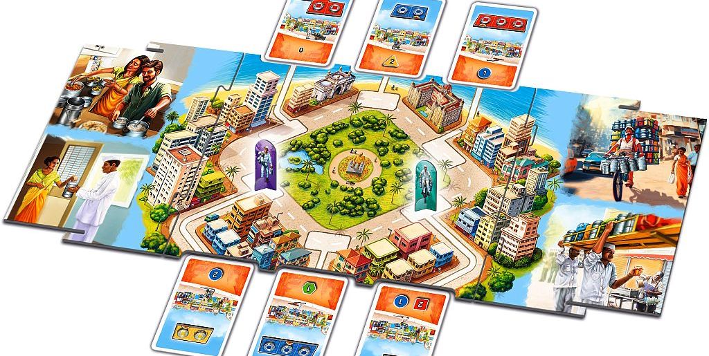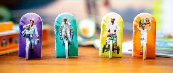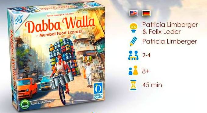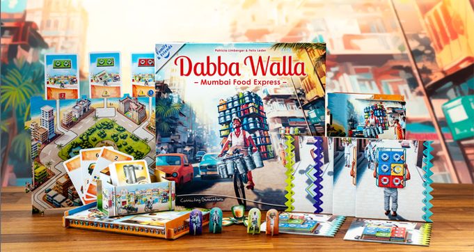 Potom mají poslíčci zvaní Wallas volno, aby mezi 14. až 18. hodinou opět sesbírali prázdné nádoby a stejným postupem je dovezli zpět do domovů zákazníků pro další den. Právě těmto plechovým nádobkám na jídlo, podobným našim školním hliníkovým stohovatelným hrncům, se říká Dabbas. V rodinné deskové hře Daba Walla – Mumbai Food Express se stanete stejnými kurýry Daba Wallas, kteří budou v první fázi jezdit po Bombaji, sbírat jídlo a šikovně si ho stohovat na sebe, aby toho uvezli co nejvíce. V druhé půli hry pak porce dovezou konzumentům a podle aktuální výše ceny, zde pojaté formou dýšek, vyinkasují odměnu, přičemž ten Daba Walla, jaký má na konci druhé fáze nejvíce peněz, je vítězem dne. Takže hurá na kola a před kárky, jedeme sbírat a rozvážet voňavá jídla.